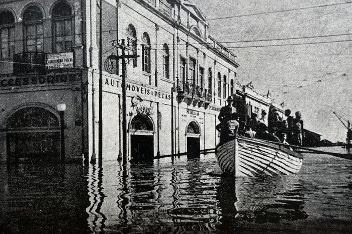 In the Fall of 1941, when incessant rain castigated Rio Grande do Sul for several weeks, my great-grandfather Rodolfo had his modest life savings invested in a rice field lease in Rio Pardo, on the banks of the river Jacuí –one of the Guaíba’s tributaries– a few dozen miles upstream from the capital. Before long, the river rose so high that, far downstream, the lagoon overflowed into Porto Alegre’s downtown, leaving a quarter of the city’s population displaced. In a convergence of elements that, experts say, happens once every 1,500 years (although something similar did happen again in 2024), the unusually punishing rain was met at the end of the lagoon by strong Atlantic winds and unfavorable tides, turning the Guaíba watershed into a monumental clogged bathtub for several weeks. Back in Rio Pardo, the rice had drowned. Rodolfo’s jet black hair, his wife Emma Amélia would keep recounting until the end of her life, went gray overnight. After the rice was gone, Rodolfo became a butcher.